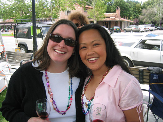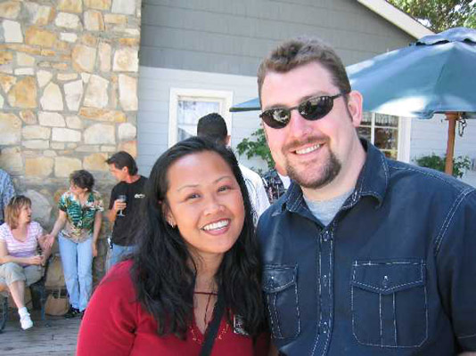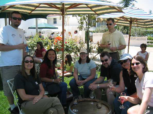 Sunday started off with the packing of bags and the packing of cars. After checking out from the motel, the group headed down the road towards the park in search of coffee and breakfast. They found Brewed Behavior. With caffeine in our blood streams and food in our bellies, it was time to get to the first winery open house of the day, but oddly enough not to taste the wine. Casa de Caballos Vineyards is not only a winery, it's a horse farm too. They breed and train Arabian horses for competition. While watching the horses in the training ring, we found out that Mike's smoothness doesn't necessarily carry over to horses. As he walked past one feisty filly that was being taken back to the stables she reared up at him making for a great picture that nobody took. We couldn't find out "how much for Ultra Violet," so it was time to go meet up with Michelle & Chad at Wild Horse Winery & Vineyard. The weather wasn't too hot, and the bluegrass band played some good background music. With so many varietals to choose, from Italians to Rhones to virtual vineyards to Vitis Vinifera, it's amazing how much the 2000 Tempranillo seemed to be the most talked about over the course of the weekend. With our first tasting under our belts, it was off to try one of the new favorites from the park. Located inside Herrmann's Chocolate Lab & Ice Cream Parlor in downtown Templeton, Changala Winery had by far the best deal of the weekend: a wine tasting with complimentary logo glass, flavored chocolate samples, and lamb tacos grilled over a Santa Maria barbecue for only $4. Pretty much everybody left here with a purchase of wine, and some with chocolate too. Some of the more popular bottles were the 2001 Chardonnay, 1998 Cabernet Sauvignon - Paso Robles, 1999 Cabernet Sauvignon - Pianetta Vineyard, 1999 Cabernet Sauvignon - Westside, and 1999 Zinfandel - Dante Dusi Vineyard. A switch in the original order took us to Grey Wolf Vineyards & Cellars. The cover band butchered every song they played and had their amplifiers turned up to 11 even though everybody was only ten feet away. Their "Zinful Cab" table wine and 2000 "Alpha" Cabernet Sauvignon were once again big hits. The group walked away with three bottles per couple and a case discount. After saying bye to Duane & Terry, we headed for the next stop just up Highway 46 West at Hunt Cellars. We arrived too late for the barbecue, but some of the appetizers were still on the table. The pourers were a happy bunch and took care of us with some 1997 Petite Syrah, 1999 "Serenade" Syrah, and 1999 "Cab-Ovation" Cabernet Sauvignon. They really took care us with both the 2000 "Zinful Delight" Zinfandel-based Port and the 2000 "Good Vibrations" Cabernet Sauvignon-based Port. The surprise bottle was the unreleased and unforgetable 2000 "Bon Vivant" Cabernet Sauvignon. At this point, the group started breaking up. Michelle & Chad headed for home, and Marge & Mike made their way towards Interstate 5 stopping by Tobin James Cellars for a taste first. They cowboyed up to the bar for some tastes of the 2000 "Paradiso" Sangiovese, 2000 "Made in the Shade" Merlot, 2000 "Rock-n-Roll" Syrah, and the sweet 2001 "Charisma" dessert wine. Nicole & Adam, and Jill & Chad also made one last stop on their way out of town to Rabbit Ridge Winery & Vineyards. It was the grand opening weekend of their Paso Robles tasting room. Some highlights of the tasting were the 2000 Chardonnay - Sonoma County, 2001 Primitivo - Westside, 2001 Reserve Petite Sirah - Paso Robles, and 1999 Winemaker's Grand Reserve Cabernet Sauvignon. And so ended a great long weekend of wine, food, and friends.