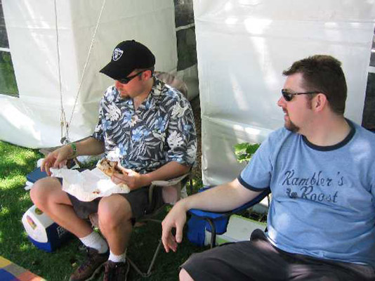- Chad N. - My best-of-tasting for the weekend was the 2001 Justin Cabernet Sauvignon. I still can't believe that it was bottled only three days prior to us tasting it. My best-of-tasting runner-up was the 2000 Hunt Cellars "Bon Vivant" Cabernet Sauvignon. On a differnet day I could easily put this as my #1. Other wines of note for me were the 2000 Carmody McKnight Cabernet Franc, 2000 Martin & Weyrich Nebbiolo, 2000 Vista del Rey "Toro Negro" Barbera, 2000 Wild Horse Tempranillo, 2000 Grey Wolf Barbera, and 2001 Rabbit Ridge Zinfandel - Westside. The winemaker's dinner was great, but a little expensive to do every year. The food makes me want to go to the chef's restaurant though. The deal-of-the-festival was definitely the Sunday open house at Changala. The wine was good, the chocolate was good, and the lamb tacos were perfect. I'm definitely up for going back there next year. Speaking of which, I got the feeling we're kind of in a rut at the festival. Maybe next year we should change it up and concentrate on the "Way Out Wineries" of Justin and Carmody McKnight and such or wineries along Highway 46 East like Tobin James, DiCarlo and others.