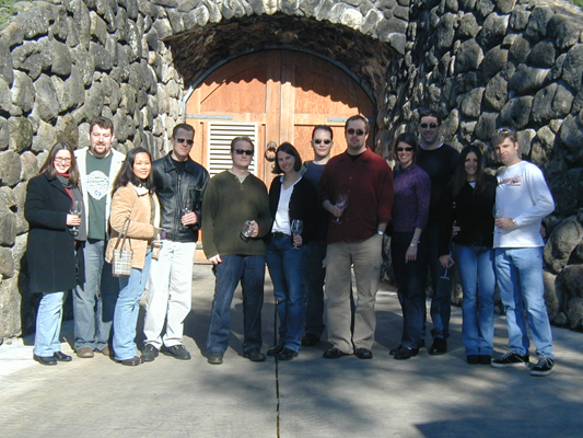 The largest Grape Juice Plus group evar gathered at Alexander Valley Vineyards to start the day. Thirteen 'Vineyard Cats' sampled the 2002 "New Gewurz" Gewurztraminer, 2001 "Sin Zin" Zinfandel, and 2000 "Cyrus" Bordeaux-style red wine barrel taste. Although always delicious, the hors d'oeuvres they were serving seemed to really outshine the wine this year. After a history making group photo in front of the Hobbit hole (where's my damn pipeweed at?), everybody jumped back in their cars and caravaned north to old-town Geyserville to visit the tasting room of The Meeker Vineyard. Housed in a former bank, the tellers were serving up the 1999 Bartolomei Brothers Zinfandel, 2001 "Barberian" blended red wine, and 1999 "Four Kings" blended red wine. All these wines went nicely with the three varieties of grilled sausage they were serving. The 2001 Tu Tu Luna was one of the better dessert wines of the day. As a bonus, some members of the group tried out a few neighboring tasting rooms that weren't on schedule. These places were not part of the Winter Wineland, but were giving free pours to event participants anyway. With a little extra wine staining our teeth, the group began its journey back southward, taking a short freeway jaunt to the Trentadue Winery. The red wine here was not real exciting, which brings us to their dessert wines. The 2001 Viognier-based white port, and no-vintage flavor-enhanced "Chocolat Amore" Merlot-based port were hits amongst the sweet wine aficionados. The now officially fourteen member group piled back into their cars and headed southward once again, but this time down Healdsburg Avenue to the Simi Winery. One of the longest wineries around, we couldn't figure out which of the four driveways to pull into. Spread out along the wine bar, the group tasted the 2001 Sauvignon Blanc, 2000 Shiraz, & 2000 Cabernet Sauvignon. They had some pretty good Tawny Port too, but you had to sweet talk the pourers to get some (always go tasting with Jill). Winding our way a few blocks southward once more, we arrived at what would be our final stop of the day, the Seghesio Family Vineyards. Other wineries should take a lesson from this place on how to make a special event not seem like it's just another day. They opened up the cellar where they served their 2001