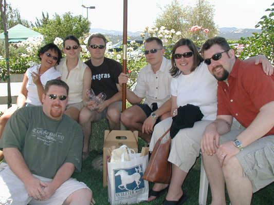 Sunday's opening houses started off, where else, but at Wild Horse Winery & Vineyard in Templeton. They had their usual large selection with a couple of new ones thrown in. The 2002 Blaufrankisch (which is an Austrian grape, we were told), 2000 'Lover' red table wine, and 2000 'Valentina' red table wine were all added to the list of Rhone and Italian varietals that make up their wine offerings. Our second stop for the day took us back to the lamb tacos that made such an impression on us the previous year. Changala Winery served a 2002 Santa Barbara County Viognier, 2001 'Synergy' red table wine, 1999 Westside Cabernet Sauvignon, 1999 Dante Dusi Vineyard Zinfandel and some others with our lunch. The chocolate fountain inside Herrmann's Chocolate Lab & Ice Cream Parlor was pretty inviting also. Our last stop for the weekend led us back to Grey Wolf Vineyards & Cellars for a chance to make-up for last year's debauchery. Lucky for them, they kind of succeeded. The sausage, bread, and cheese were back, the horrible band was gone, and Lucy the dog was still wandering around. The wine was a little better too. The son is starting to come into his own. Some selections that stood out were the 2003 'Little Red' Grenache, 2002 'Lone Wolf' red table wine, 2001 Mourvedre, Cabernet Franc, and 'Alpha' Cabernet Sauvignon, and the NV 'Big Bad Wolf' Estate Zinfandel. After packing some more sausage and cheese on top of those lamb tacos, it was time to hit the road for home. A beautiful sunny day followed us North and South to our respective homes (until we hit traffic). Cheers.